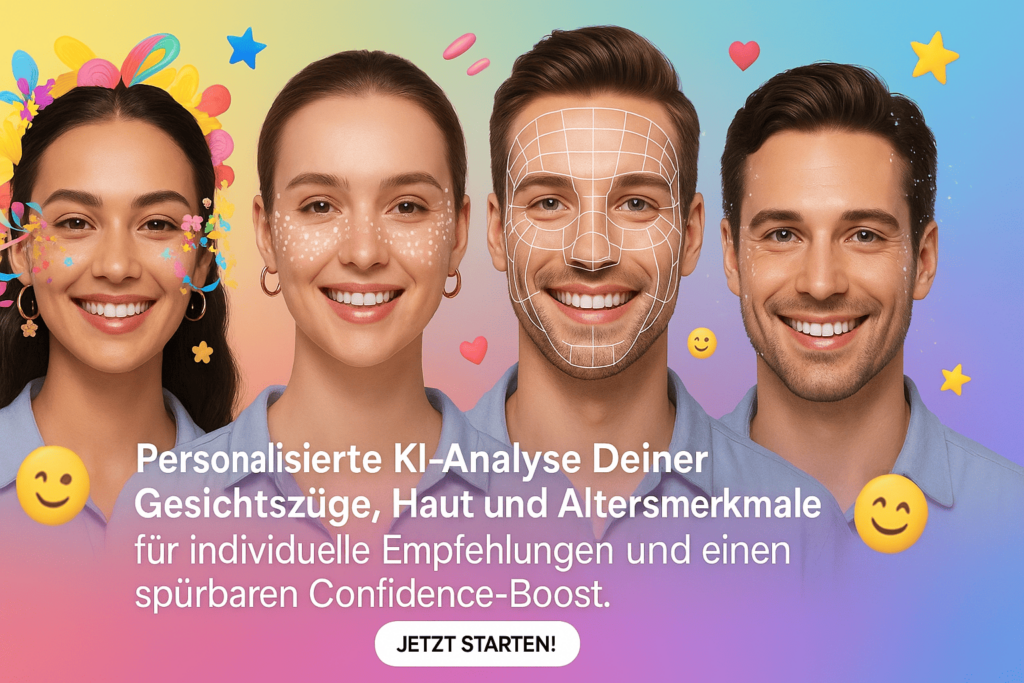 FaceDesign – Entdecken Sie Ihr wahres biologisches Alter mit KI-Präzision. Erhalten Sie umfassende Gesichtsanalyse inklusive Falten, Symmetrie, Hautqualität und personalisierte Empfehlungen. Mit Bestätigung der Schaltfläche Zahlungspflichtig bestellen stimmen Sie den allgemeinen Geschäftsbedingungen zu. FaceDesign gewährt Ihnen einen Monat lang unbegrenzten Zugang. Die Abrechnung erfolgt über die Mobilfunkrechnung.
